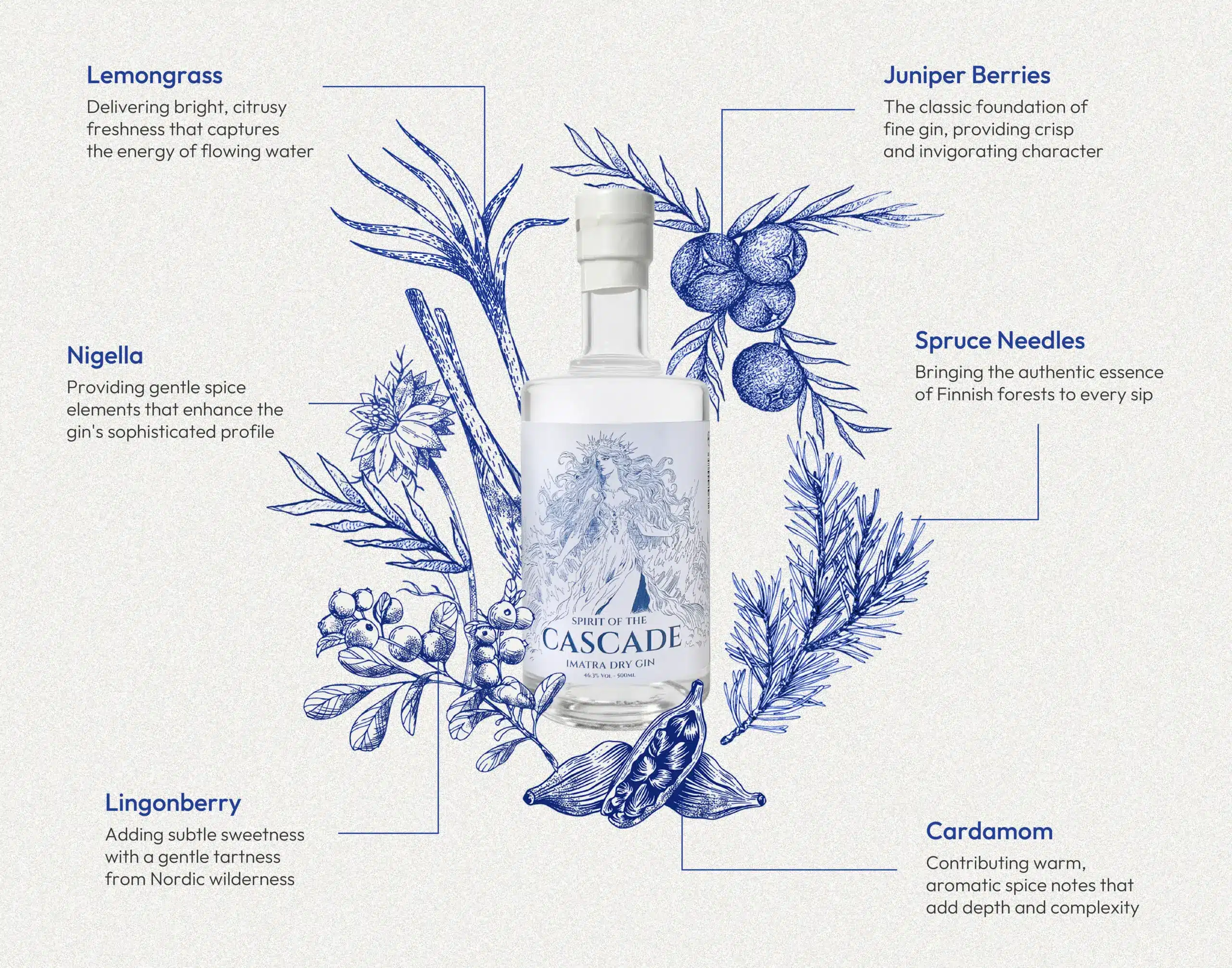 Each botanical is selected for its quality and contribution to the distinctive character that makes Spirit of the Cascade a true expression of The Famous Imatra Spirit.